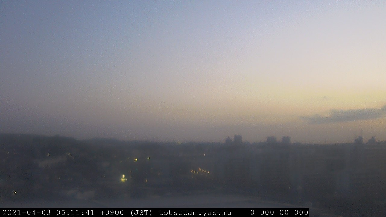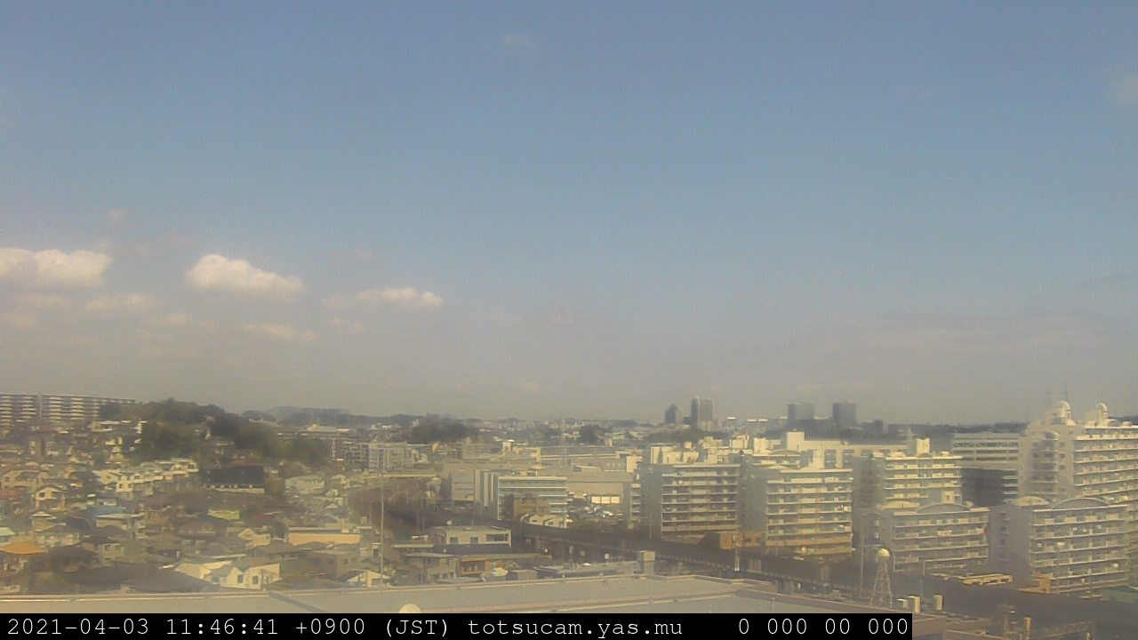 横浜市戸塚駅周辺から 東戸塚方面(北北東)を望む展望カメラの映像です。 左は現在の映像です。 下に並んでいるのは、 7日間に亘る日の出どき、昼間、夕暮れどきの写真(サムネイル)です。 それぞれ、日の出15分前、南中時、日没20分後の写真となっています。 各写真の下にはmpeg形式の動画へのリンクがあります。 それぞれ、日の出、南中、日没の前後1時間の画像です。 右欄にはその日24時間の動画へのリンクがあります。 この7日間以外は日付が一覧表示されています。 日付部分をクリックすると、 その日付から7日分が展開されて表示されます。