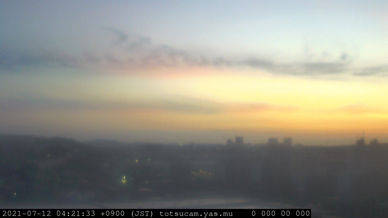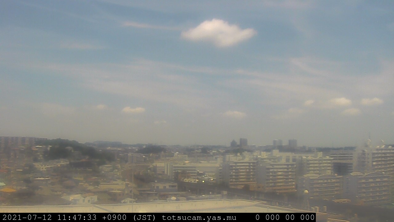 横浜市戸塚駅周辺から 東戸塚方面(北北東)を望む展望カメラの映像です。 左は現在の映像です。 下に並んでいるのは、 7日間に亘る日の出どき、昼間、夕暮れどきの写真(サムネイル)です。 それぞれ、日の出15分前、南中時、日没20分後の写真となっています。 各写真の下にはmpeg形式の動画へのリンクがあります。 それぞれ、日の出、南中、日没の前後1時間の画像です。 右欄にはその日24時間の動画へのリンクがあります。 この7日間以外は日付が一覧表示されています。 日付部分をクリックすると、 その日付から7日分が展開されて表示されます。