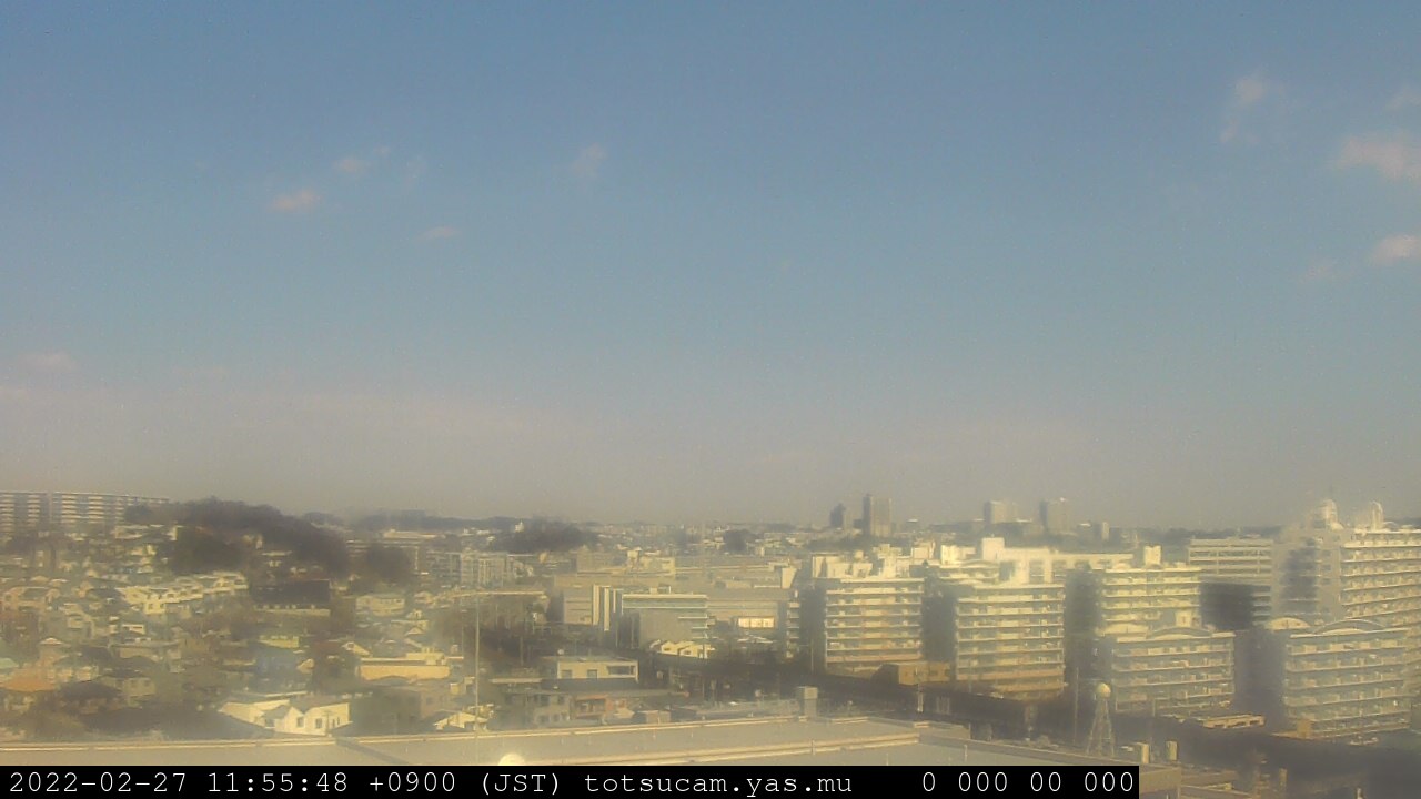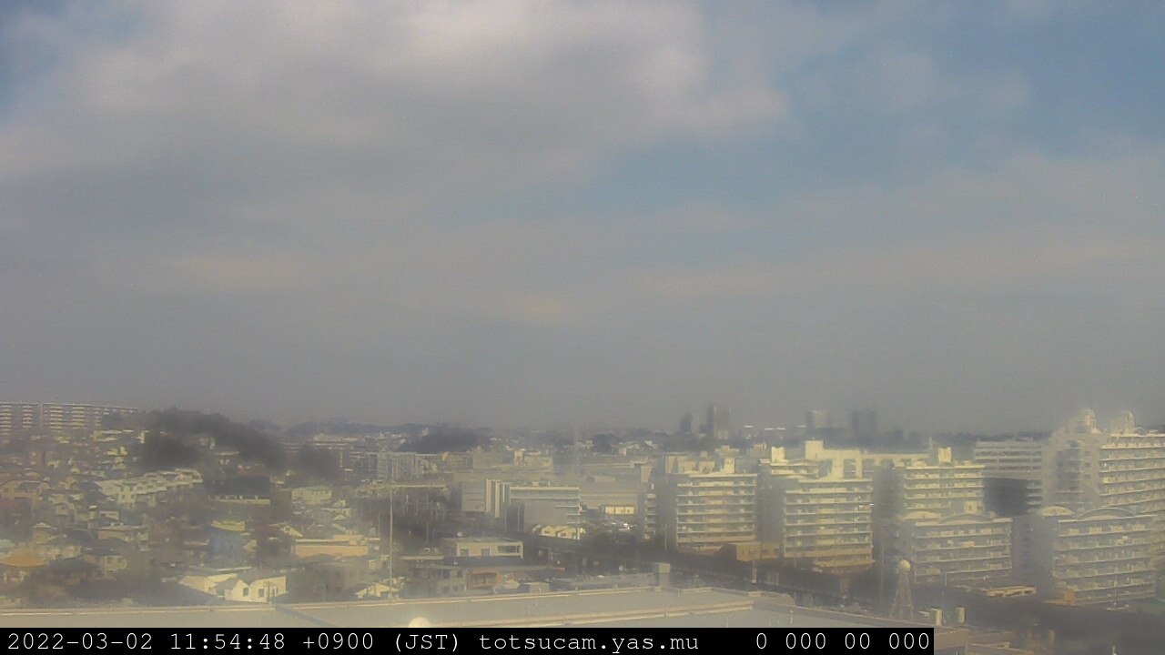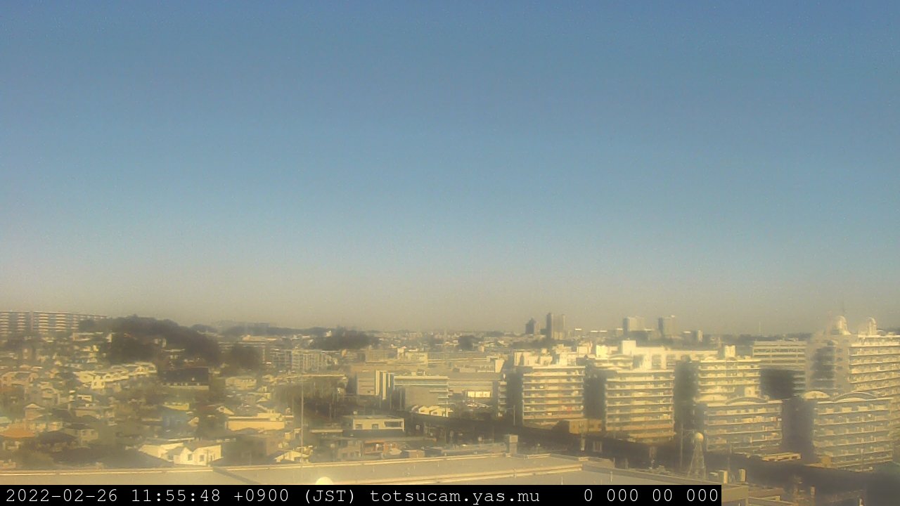 横浜市戸塚駅周辺から 東戸塚方面(北北東)を望む展望カメラの映像です。 左は現在の映像です。 下に並んでいるのは、 7日間に亘る日の出どき、昼間、夕暮れどきの写真(サムネイル)です。 それぞれ、日の出15分前、南中時、日没20分後の写真となっています。 各写真の下にはmpeg形式の動画へのリンクがあります。 それぞれ、日の出、南中、日没の前後1時間の画像です。 右欄にはその日24時間の動画へのリンクがあります。 この7日間以外は日付が一覧表示されています。 日付部分をクリックすると、 その日付から7日分が展開されて表示されます。
