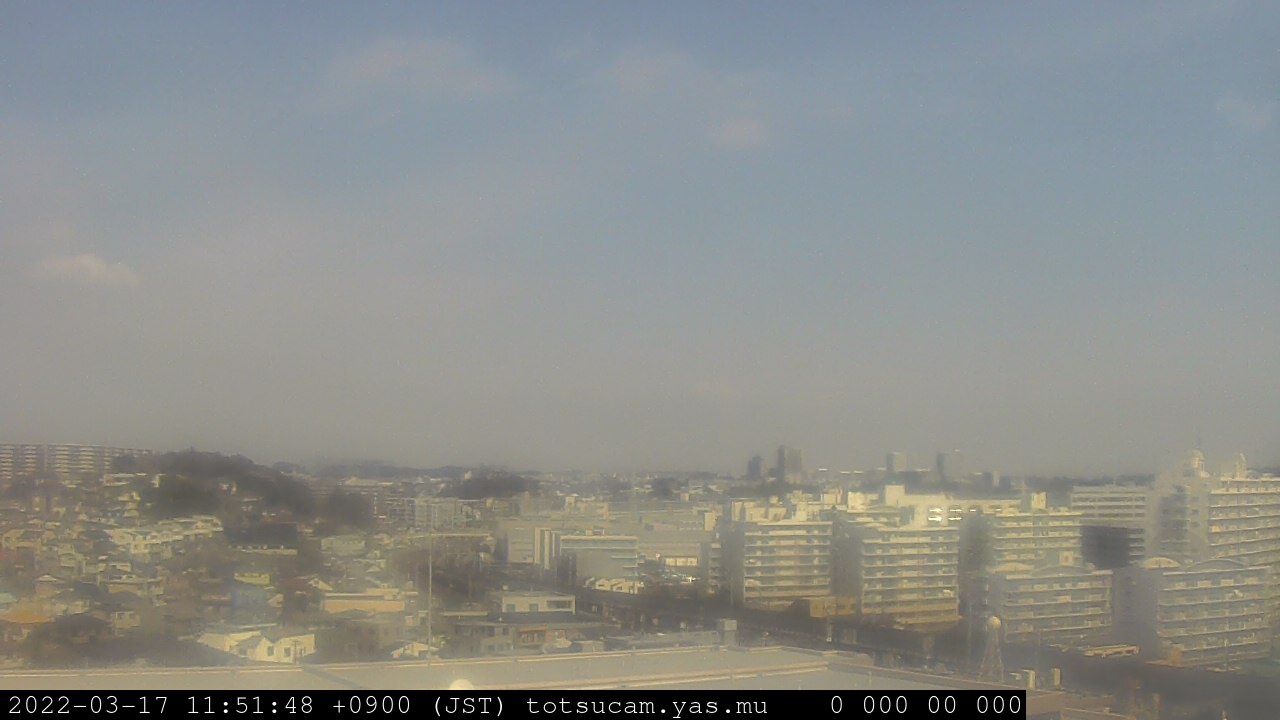 横浜市戸塚駅周辺から 東戸塚方面(北北東)を望む展望カメラの映像です。 左は現在の映像です。 下に並んでいるのは、 7日間に亘る日の出どき、昼間、夕暮れどきの写真(サムネイル)です。 それぞれ、日の出15分前、南中時、日没20分後の写真となっています。 各写真の下にはmpeg形式の動画へのリンクがあります。 それぞれ、日の出、南中、日没の前後1時間の画像です。 右欄にはその日24時間の動画へのリンクがあります。 この7日間以外は日付が一覧表示されています。 日付部分をクリックすると、 その日付から7日分が展開されて表示されます。