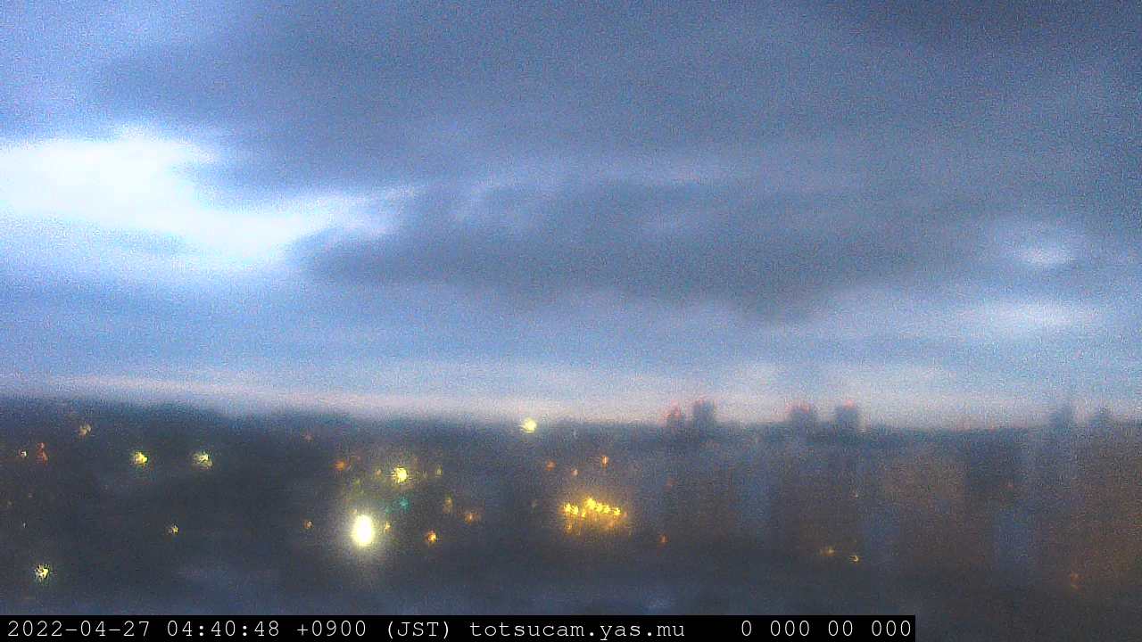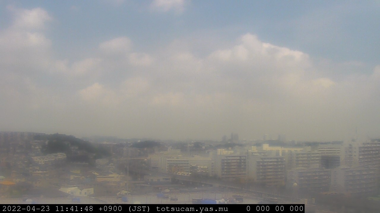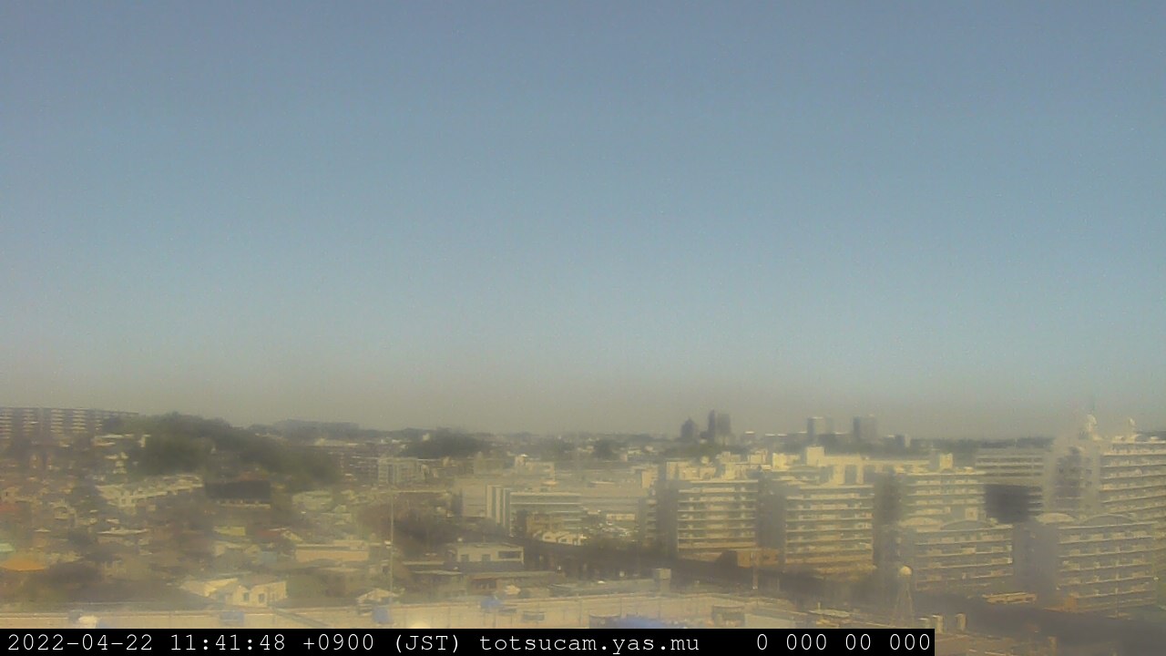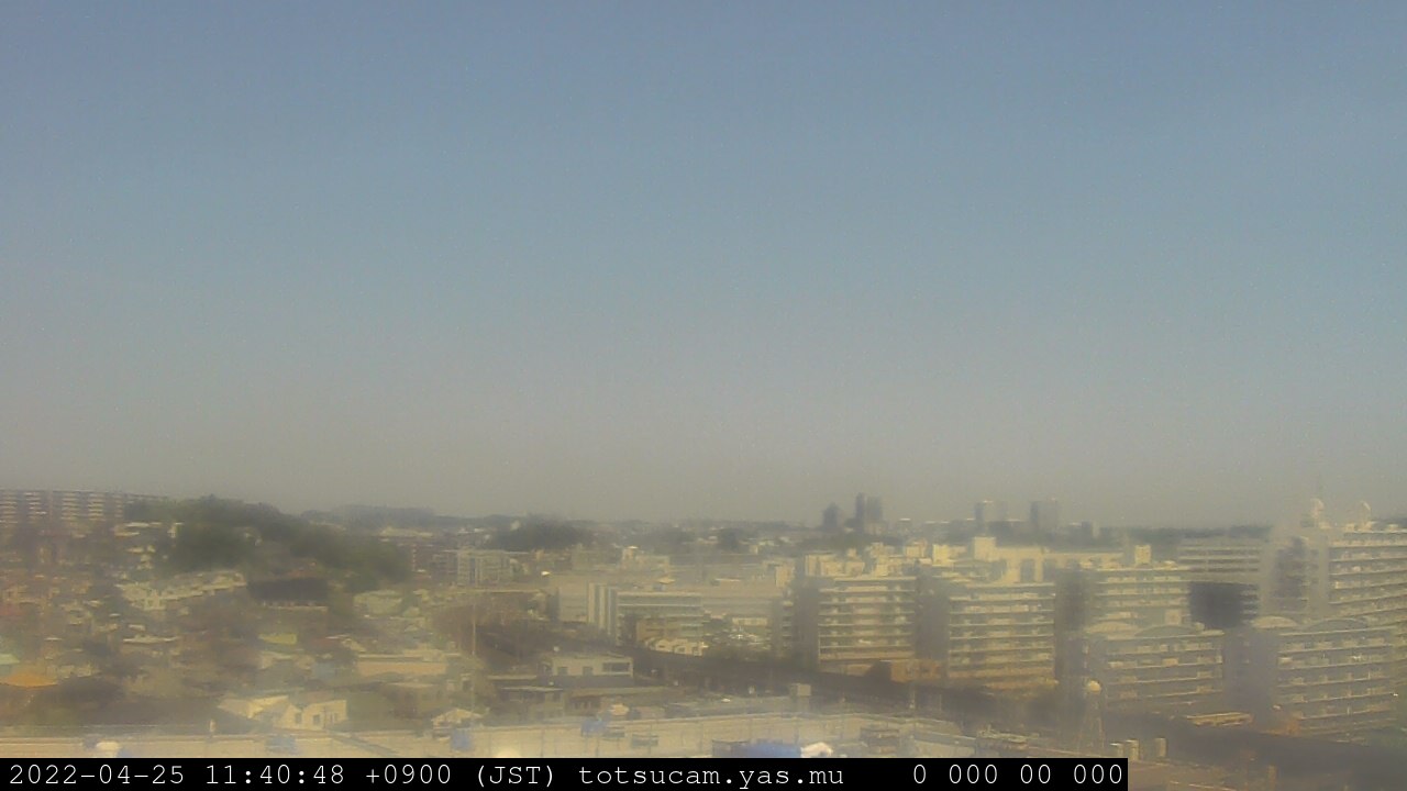 横浜市戸塚駅周辺から 東戸塚方面(北北東)を望む展望カメラの映像です。 左は現在の映像です。 下に並んでいるのは、 7日間に亘る日の出どき、昼間、夕暮れどきの写真(サムネイル)です。 それぞれ、日の出15分前、南中時、日没20分後の写真となっています。 各写真の下にはmpeg形式の動画へのリンクがあります。 それぞれ、日の出、南中、日没の前後1時間の画像です。 右欄にはその日24時間の動画へのリンクがあります。 この7日間以外は日付が一覧表示されています。 日付部分をクリックすると、 その日付から7日分が展開されて表示されます。