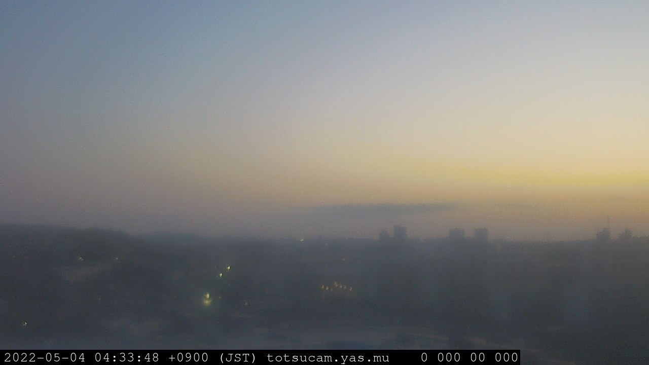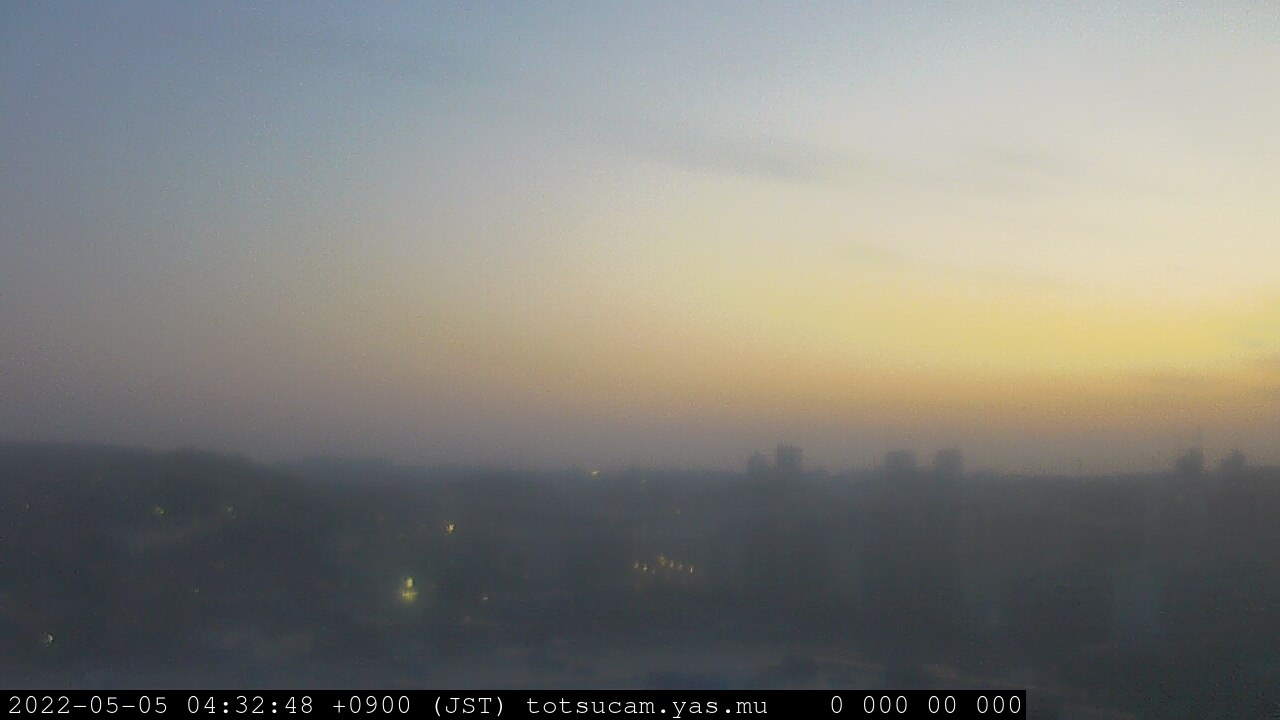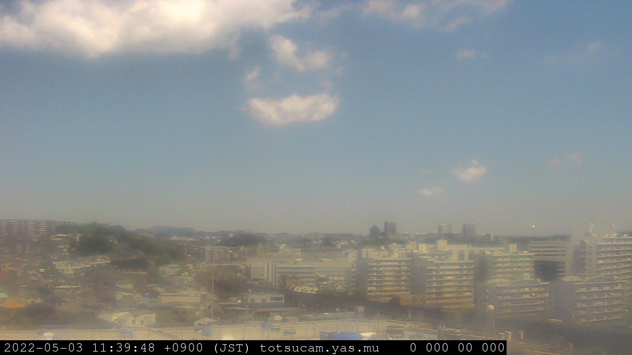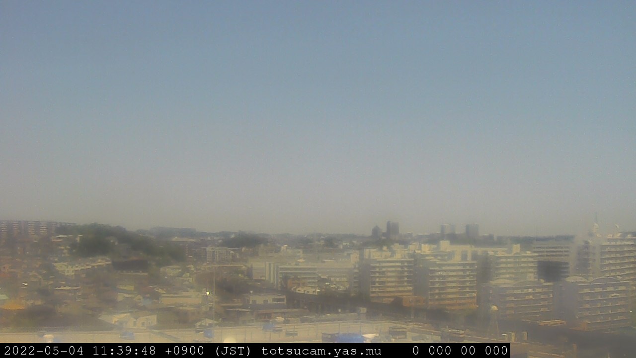 横浜市戸塚駅周辺から 東戸塚方面(北北東)を望む展望カメラの映像です。 左は現在の映像です。 下に並んでいるのは、 7日間に亘る日の出どき、昼間、夕暮れどきの写真(サムネイル)です。 それぞれ、日の出15分前、南中時、日没20分後の写真となっています。 各写真の下にはmpeg形式の動画へのリンクがあります。 それぞれ、日の出、南中、日没の前後1時間の画像です。 右欄にはその日24時間の動画へのリンクがあります。 この7日間以外は日付が一覧表示されています。 日付部分をクリックすると、 その日付から7日分が展開されて表示されます。