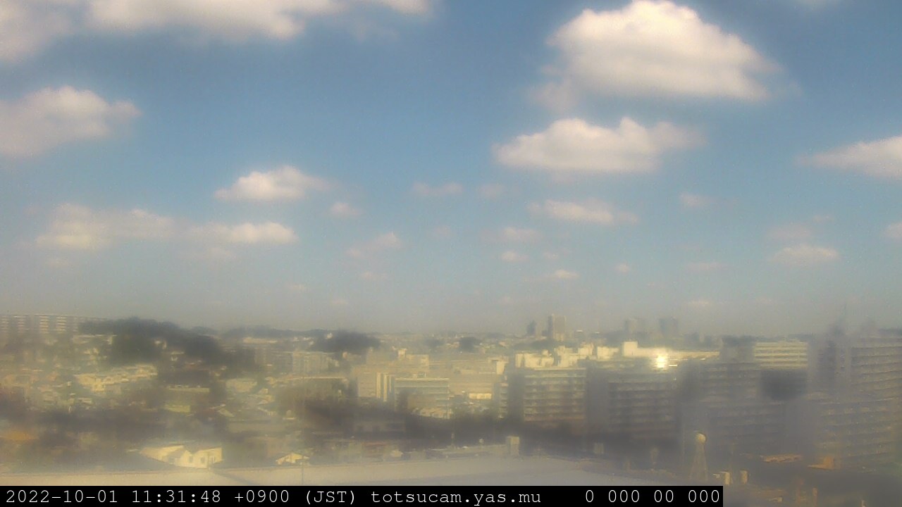 横浜市戸塚駅周辺から 東戸塚方面(北北東)を望む展望カメラの映像です。 左は現在の映像です。 下に並んでいるのは、 7日間に亘る日の出どき、昼間、夕暮れどきの写真(サムネイル)です。 それぞれ、日の出15分前、南中時、日没20分後の写真となっています。 各写真の下にはmpeg形式の動画へのリンクがあります。 それぞれ、日の出、南中、日没の前後1時間の画像です。 右欄にはその日24時間の動画へのリンクがあります。 この7日間以外は日付が一覧表示されています。 日付部分をクリックすると、 その日付から7日分が展開されて表示されます。